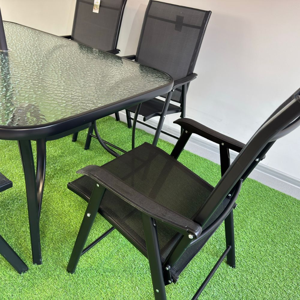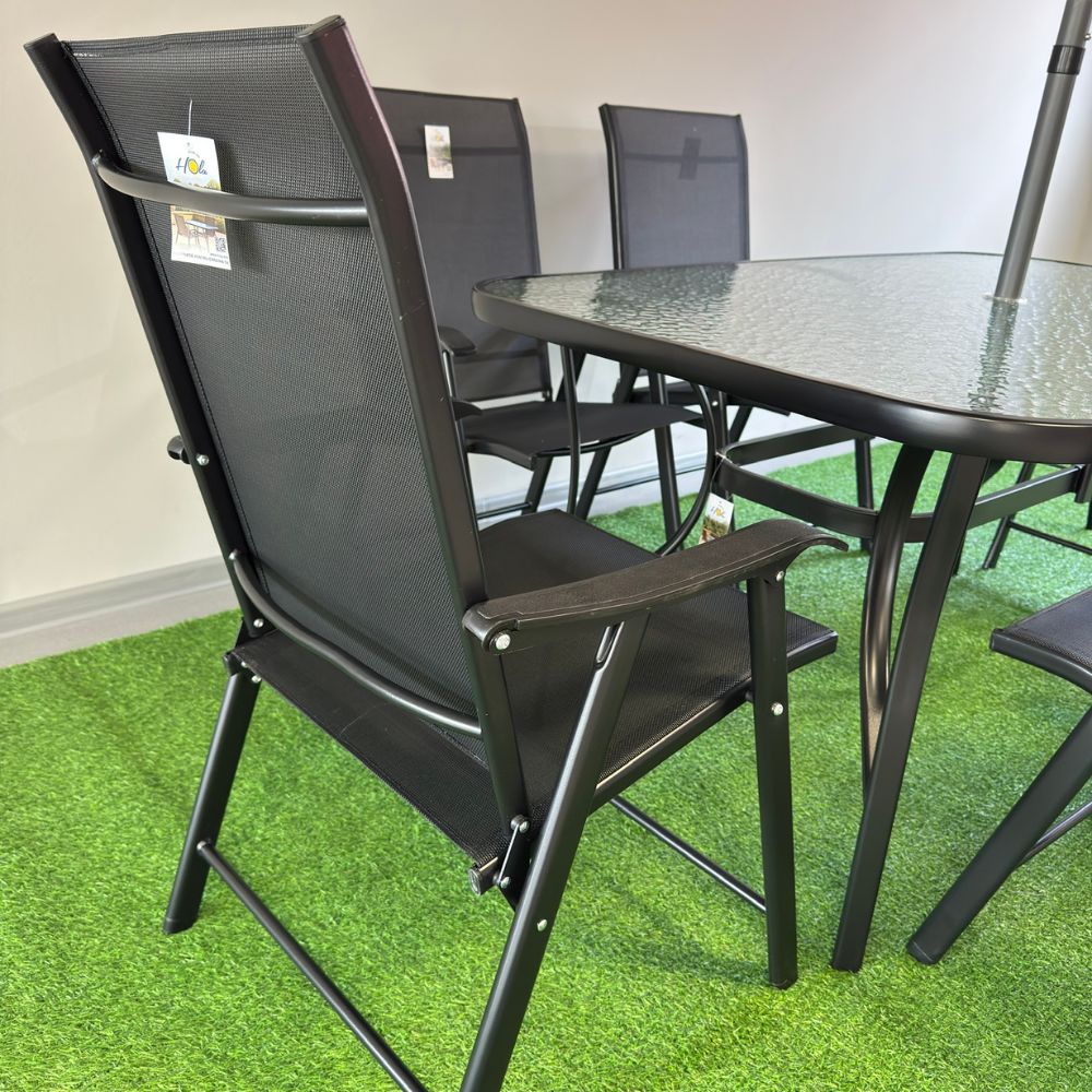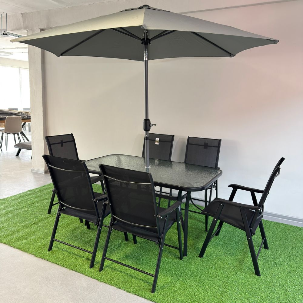 Set masă dreptunghiulară cu 6 scaune pliabile + umbrelă, metal / textilen, Negru