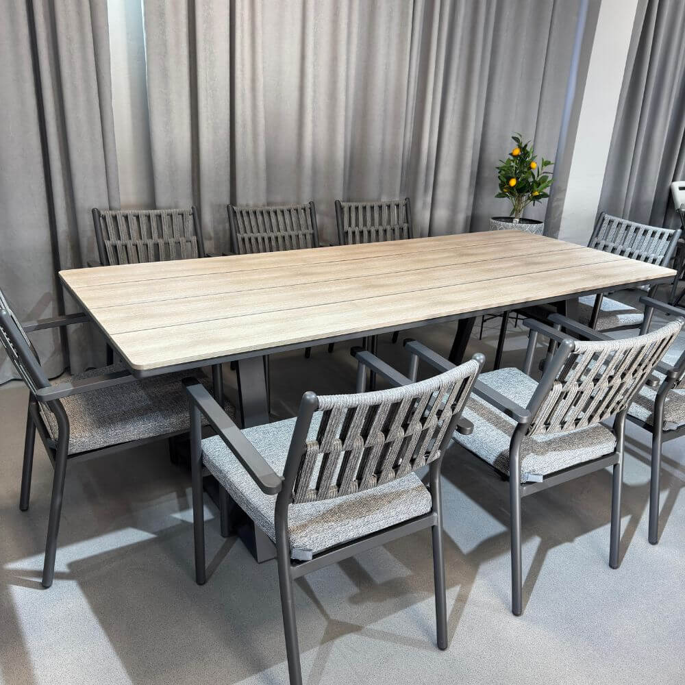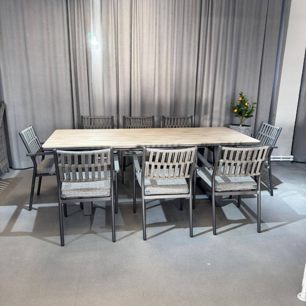O masă modernă ideală pentru terasă, grădină sau balcon. Designul minimalist, cu blat din sticlă securizată și cadru metalic robust, oferă eleganță și stabilitate. Nuanța antracit adaugă un aer sofisticat, ușor de integrat în orice decor. Perfectă pentru