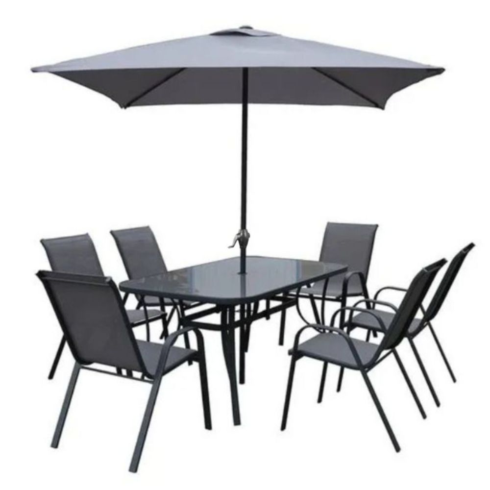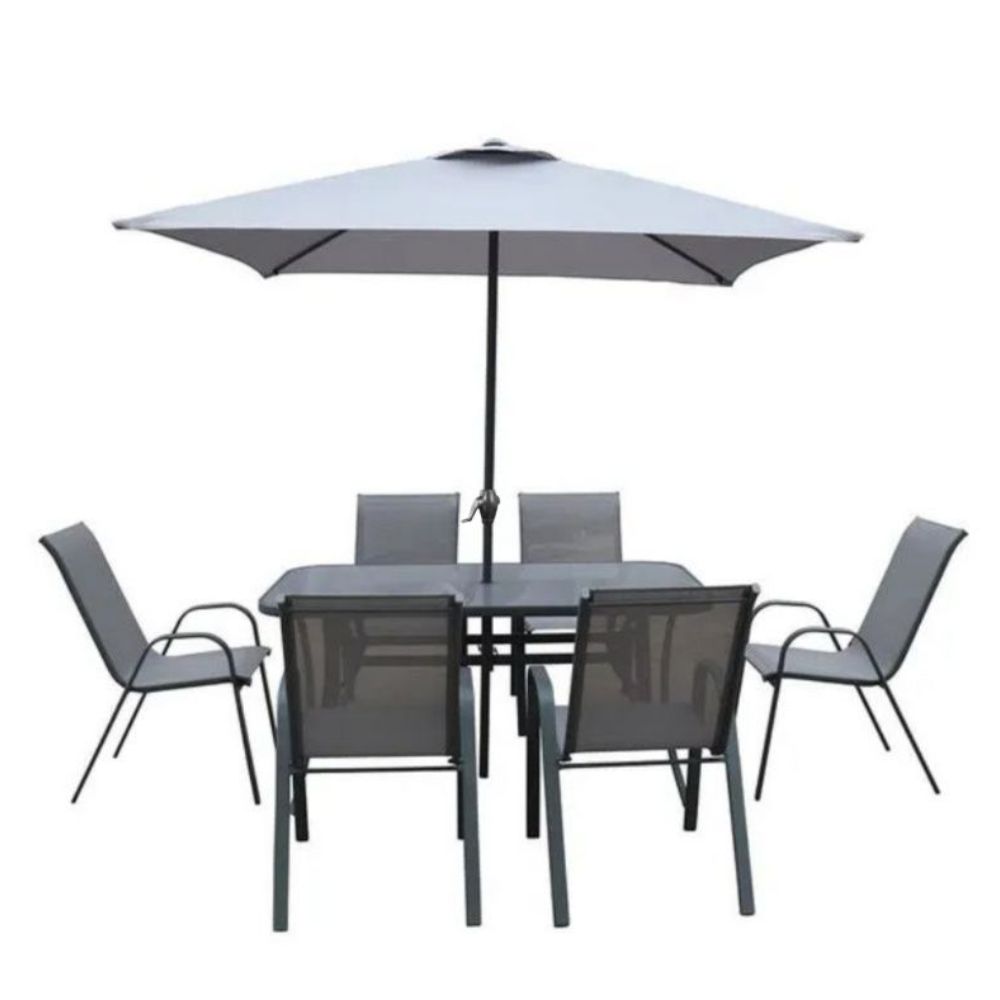 Set masă dreptunghiulară cu 6 scaune + umbrelă, metal / textilen, Gri